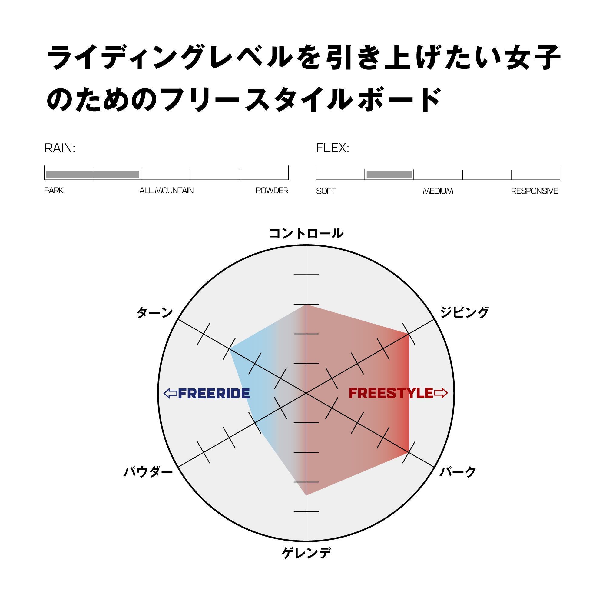 OH YEAHはあなたのライディングレベルを引き上げるために作られた、女性専用のフリースタイルボードです。ミディアムソフトのフレックスにロックアウトキャンバーを組み合わせる事であらゆる地形に対する万能性を提供します。ポップスターと足元のラバーパッドを採用することでスムーズでポップなライディングを実現します。