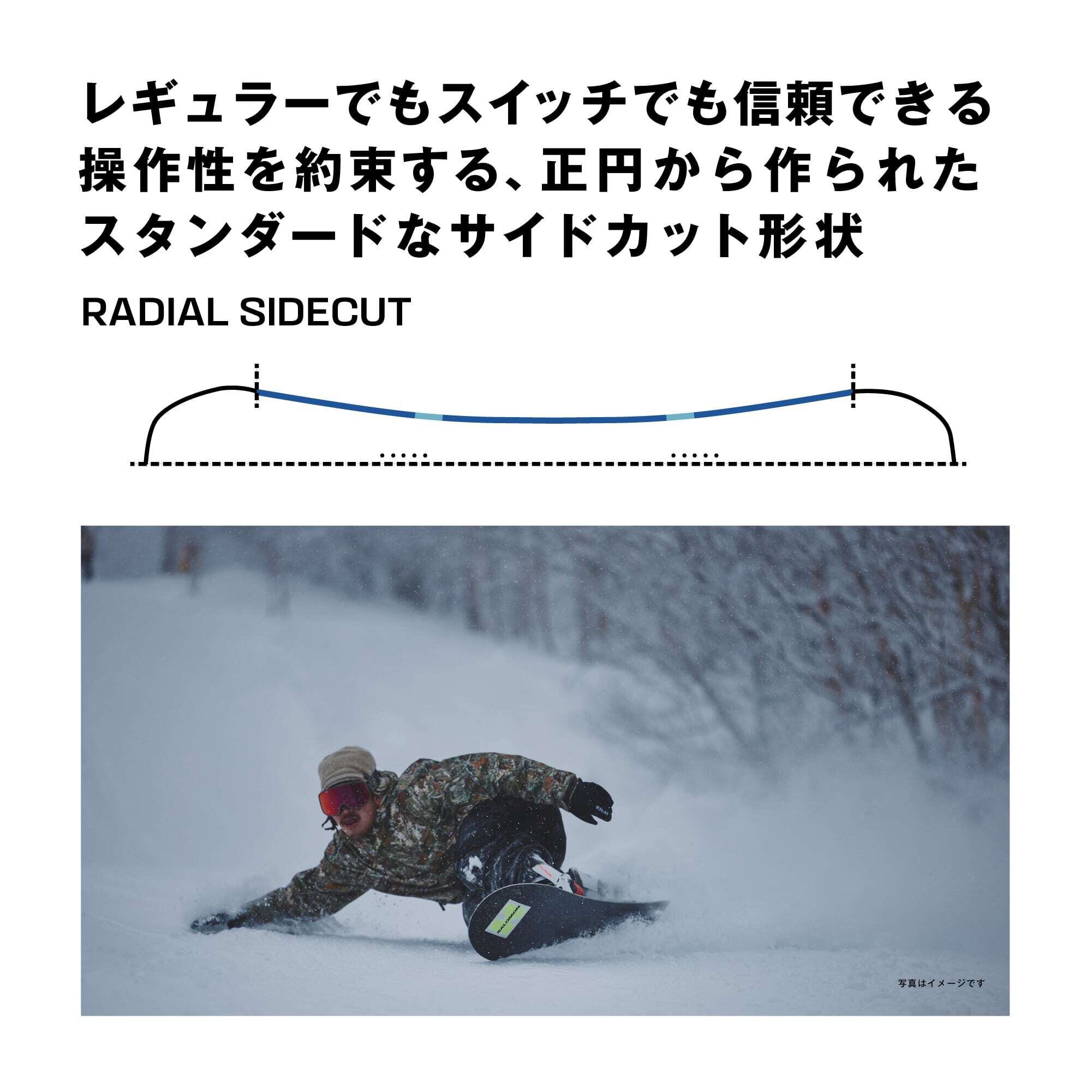 ◇ テーパードツインシェイプがテールの表面積をノーズよりも小さくし、クイックでタイトなターンを可能にします。スタンスはサイドカットのちょうど真ん中に位置するので、スイッチもお手のものです。