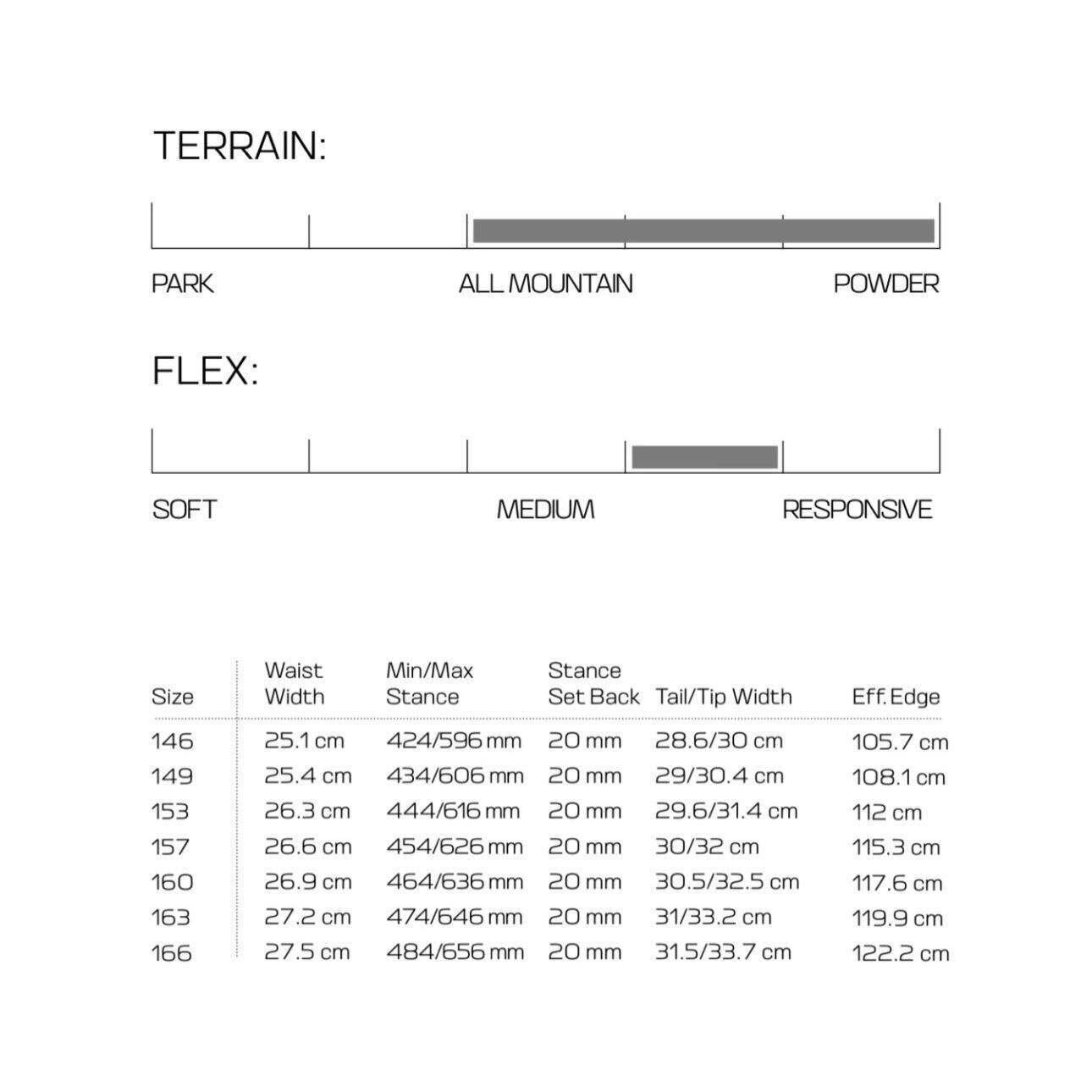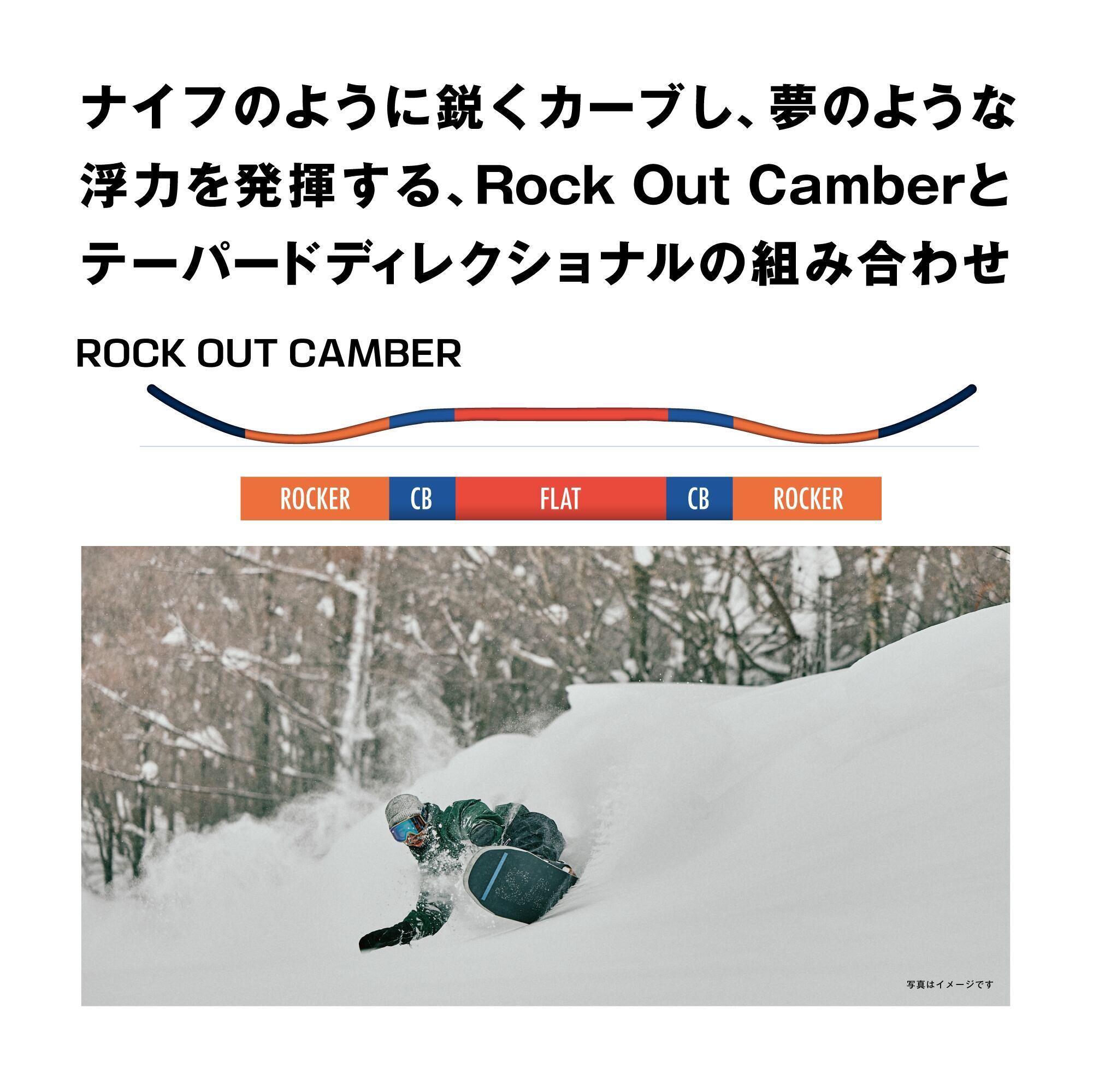 ◇ 幅広のテーパードディレクショナル形状とセットバックスタンスにRock Out Camberを組み合わせることで、深雪での優れた浮力と浮上性能を提供します。