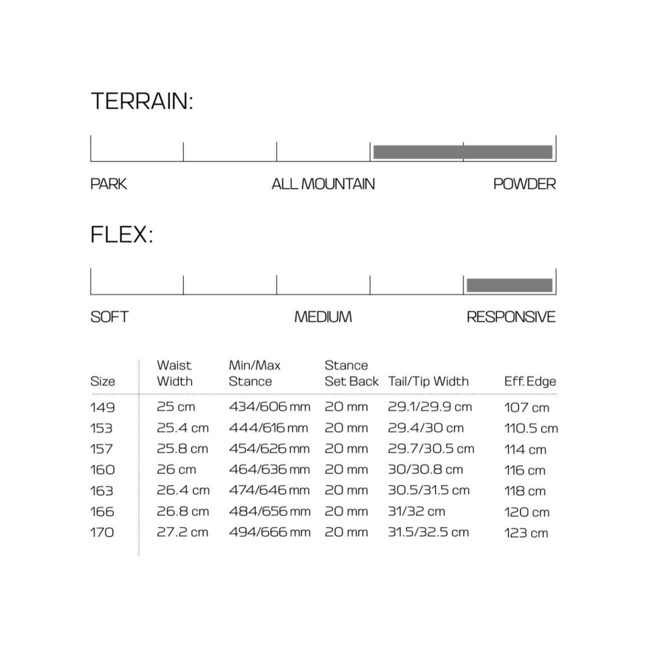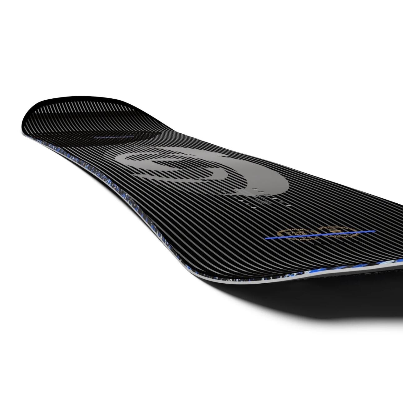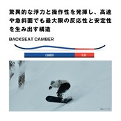 ◇ セットバックスタンスとテーパードディレクショナル形状、さらに長めのノーズロッカーが組み合わさることで、パウダーでの優れた浮力と操作性を提供します。
