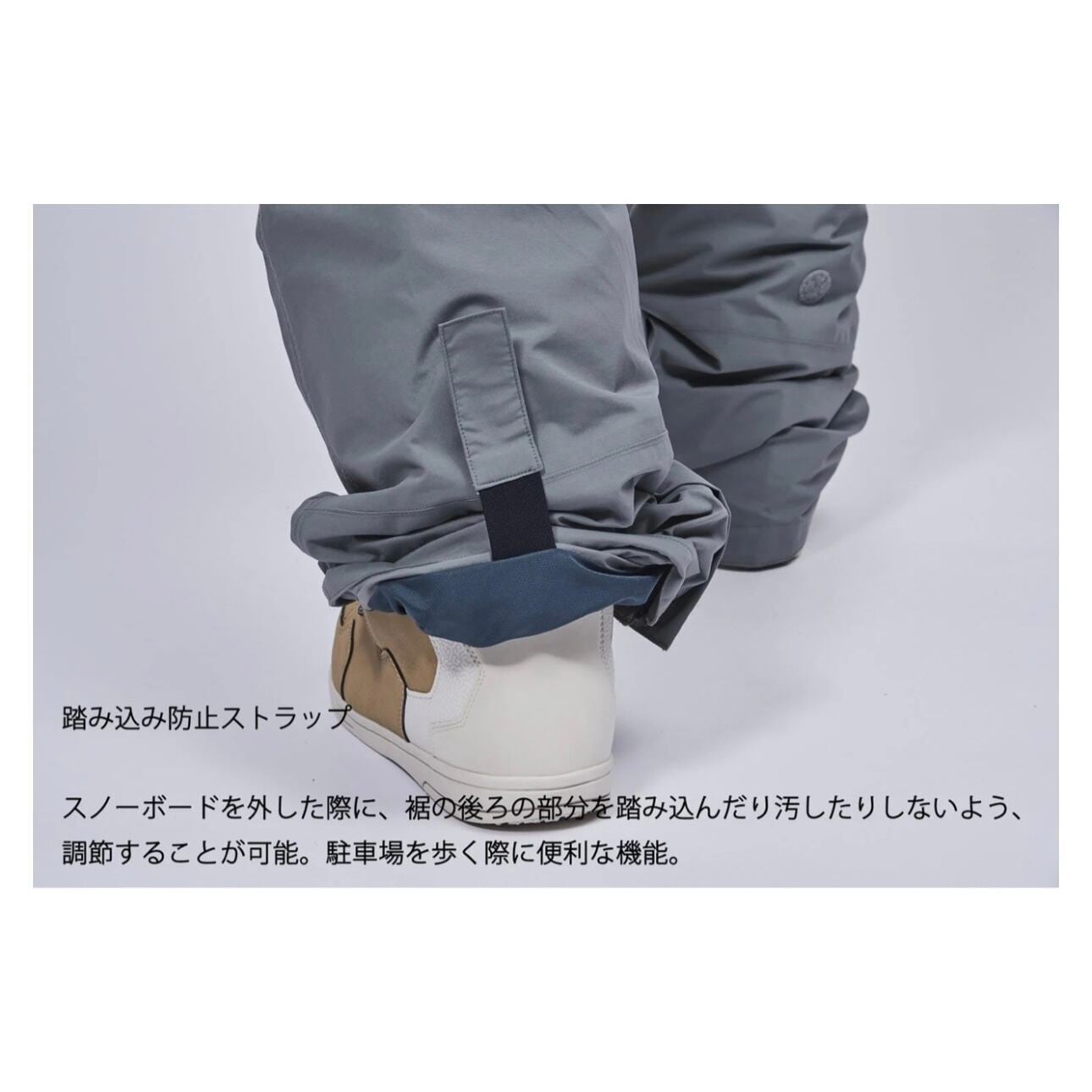 スノーボードを外した際に、裾の後ろの部分を踏み込んだり汚したりしないよう、調節することが可能。駐車場を歩く際に便利な機能。