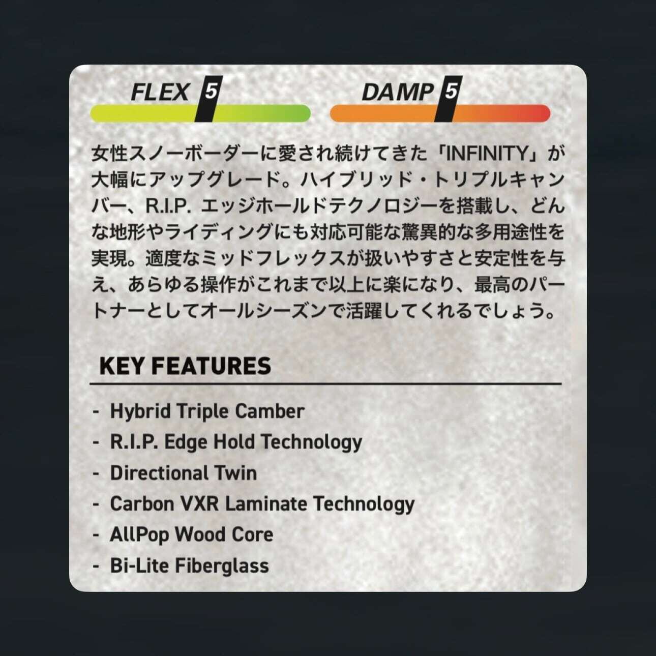 女性スノーボーダーに愛され続けてきた「INFINITY」が大幅にアップグレード。ハイブリッド・トリプルキャンバー、R.I.P. エッジホールドテクノロジーを搭載し、どんな地形やライディングにも対応可能な驚異的な多用途性を実現。適度なミッドフレックスが扱いやすさと安定性を与え、あらゆる操作がこれまで以上に楽になり、最高のパートナーとしてオールシーズンで活躍してくれるでしょう。