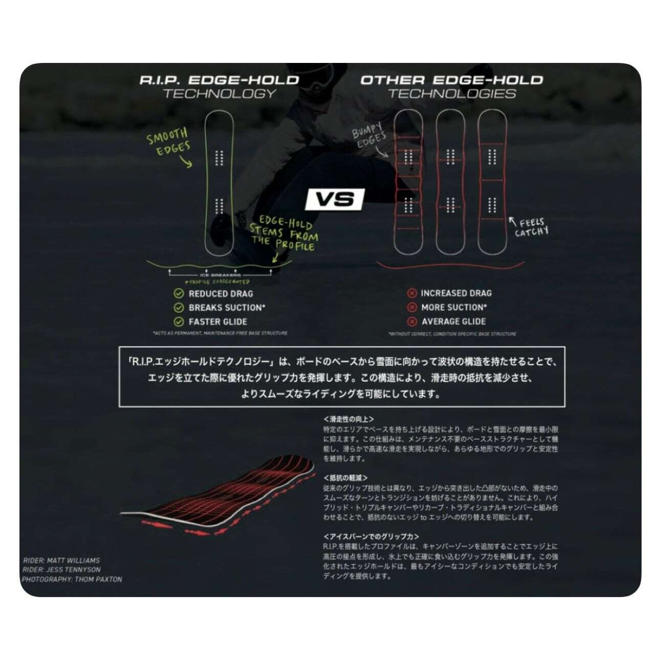 柔らかめのフレックス+非対称ツインシェイプ+ハイブリッド・トリプルキャンバーを備え、全てを『軽快』に楽しむためのボードです。その優れた多用途への適応性は、これまでに我々が作った女性用フリースタイル・オールマウンテンボードの中で最高レベルの完成度です。パークライディングからパウダー、カービングまで、どんな状況でも応えてくれる万能性と抜群の扱いやすさが魅力です。