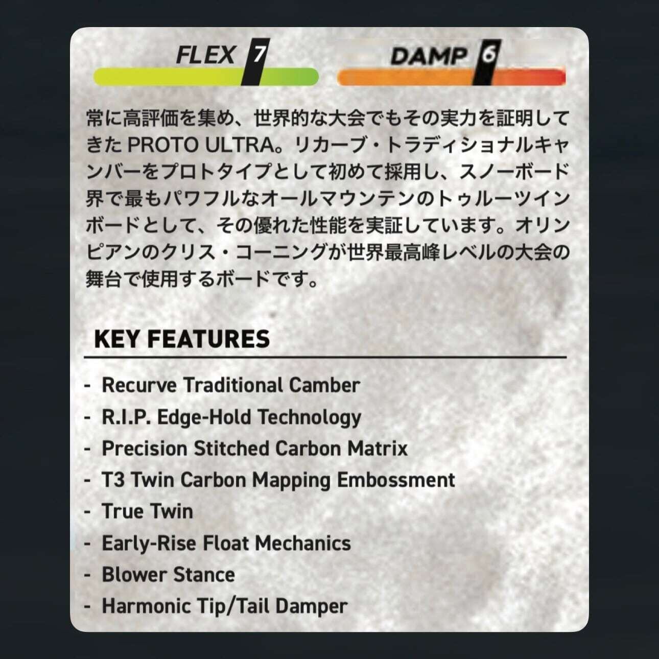 常に高評価を集め、世界的な大会でもその実力を証明してきたPROTO ULTRA。リカーブ・トラディショナルキャンバーをプロトタイプとして初めて採用し、スノーボード界で最もパワフルなオールマウンテンのトゥルーツインボードとして、その優れた性能を実証しています。オリンピアンのクリス・コーニングが世界最高峰レベルの大会の舞台で使用するボードです。