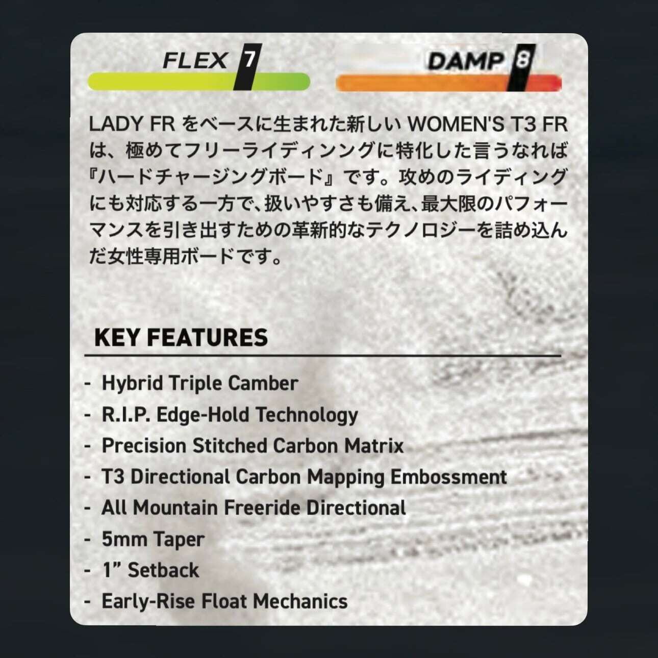 LADY FRをベースに生まれた新しい「PROTO T3 FR」は極めてフリーライディングに特化した言うなれば「ハードチャージングボード」です。攻めのライディングにも対応する一方で、扱いやすさも備え、最大限のパフォーマンスを引き出すための革新的なテクノロジーを詰め込んだ女性専用ボードです。