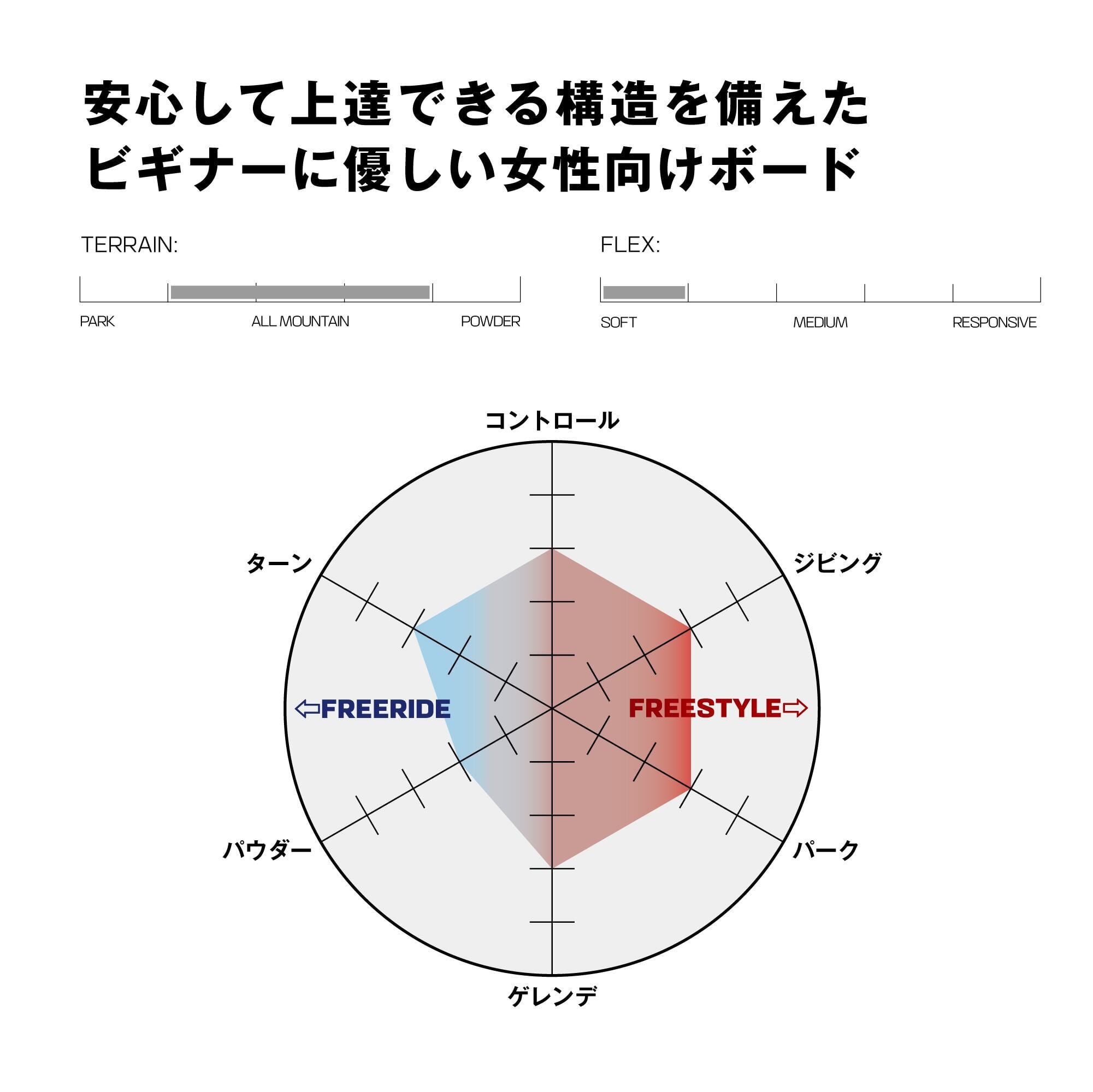 ディレクショナルツインシェイプがフリーライドとフリースタイルの両方で快適なライディングを可能とし、様々な地形にも適応します。