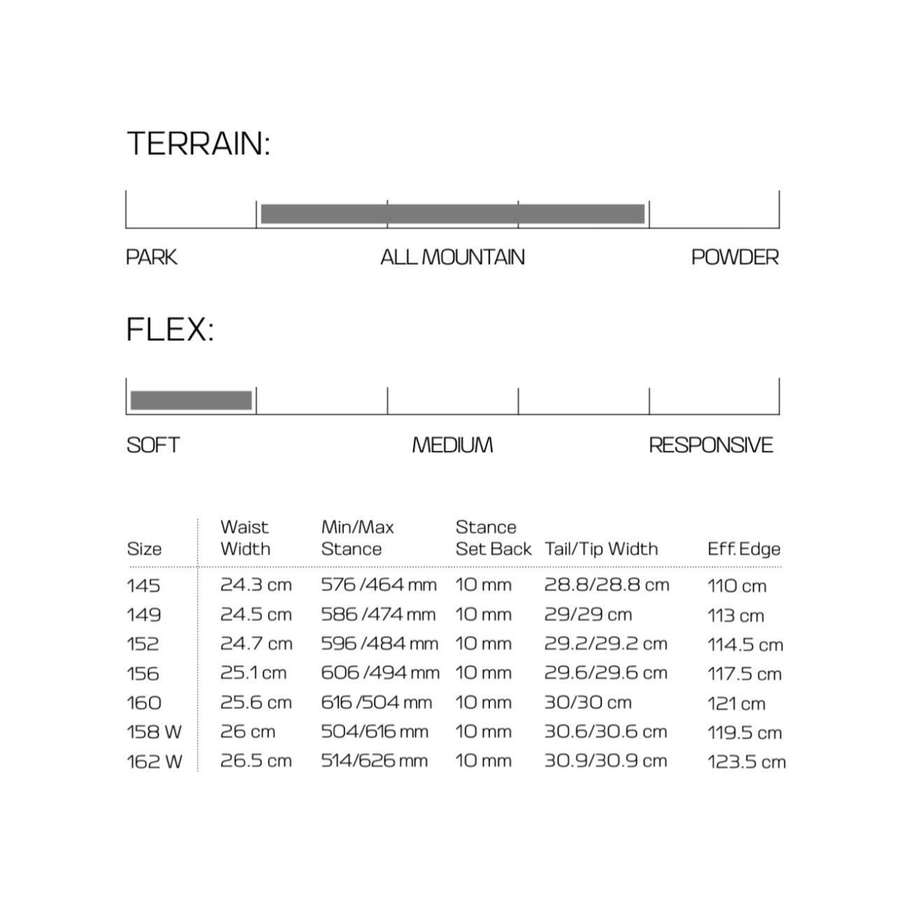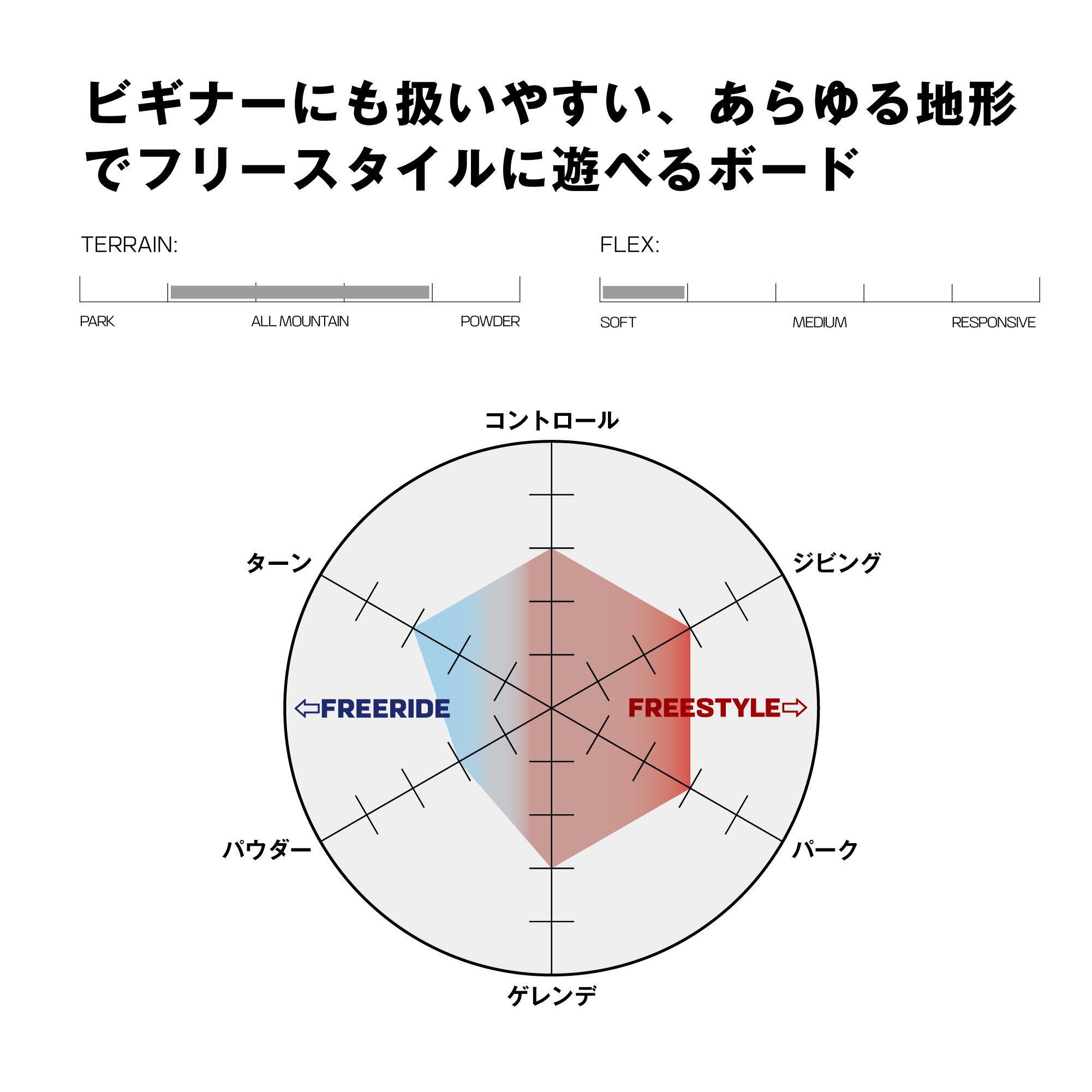 ディレクショナル・ツイン・シェイプはフリーライドとフリースタイルの両方で快適なライディングを可能とし、様々な地形にも対応します。