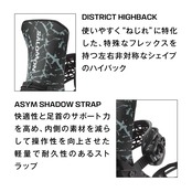 サポート性と操作性を求めるライダーたちのために、DISTRICT PRO TEAMはチームライダーからインスピレーションを得てデザインされたフリースタイル用ビンディングです。DISTRICT の持つ快適性と自然なブーツとの一体感はそのままに、よりサポート力の高いヒールカップ、より強い衝撃吸収力、より反応性の高いストラップを採用し、チームライダーたちによって作り上げられました。