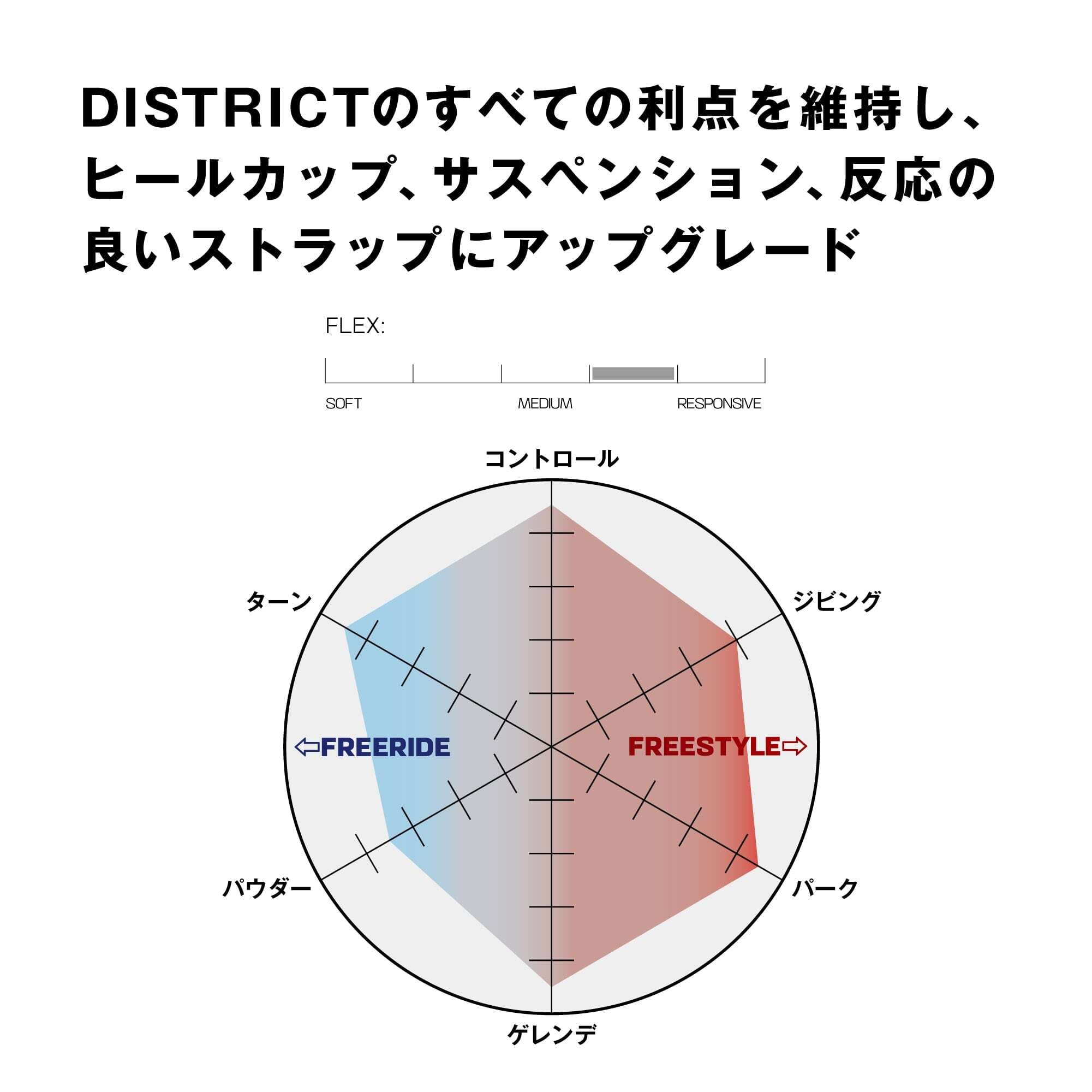 DISTRICT PRO HORIZONは、サポートとコントロールを求めるライダーのために作られ、HORIZON SERIESとのマッチングするバインディングです。異なる2つのバインディングのパーツを組み合わせたチームライダーたちのアイデアから生まれたこのモデルは、DISTRICTのすべての利点である快適さと自然な接続くを維持しつつ、よりサポート力のあるヒールカップ、アップグレードされたサスペンション、そしてさらに反応の良いストラップを備えてます。
