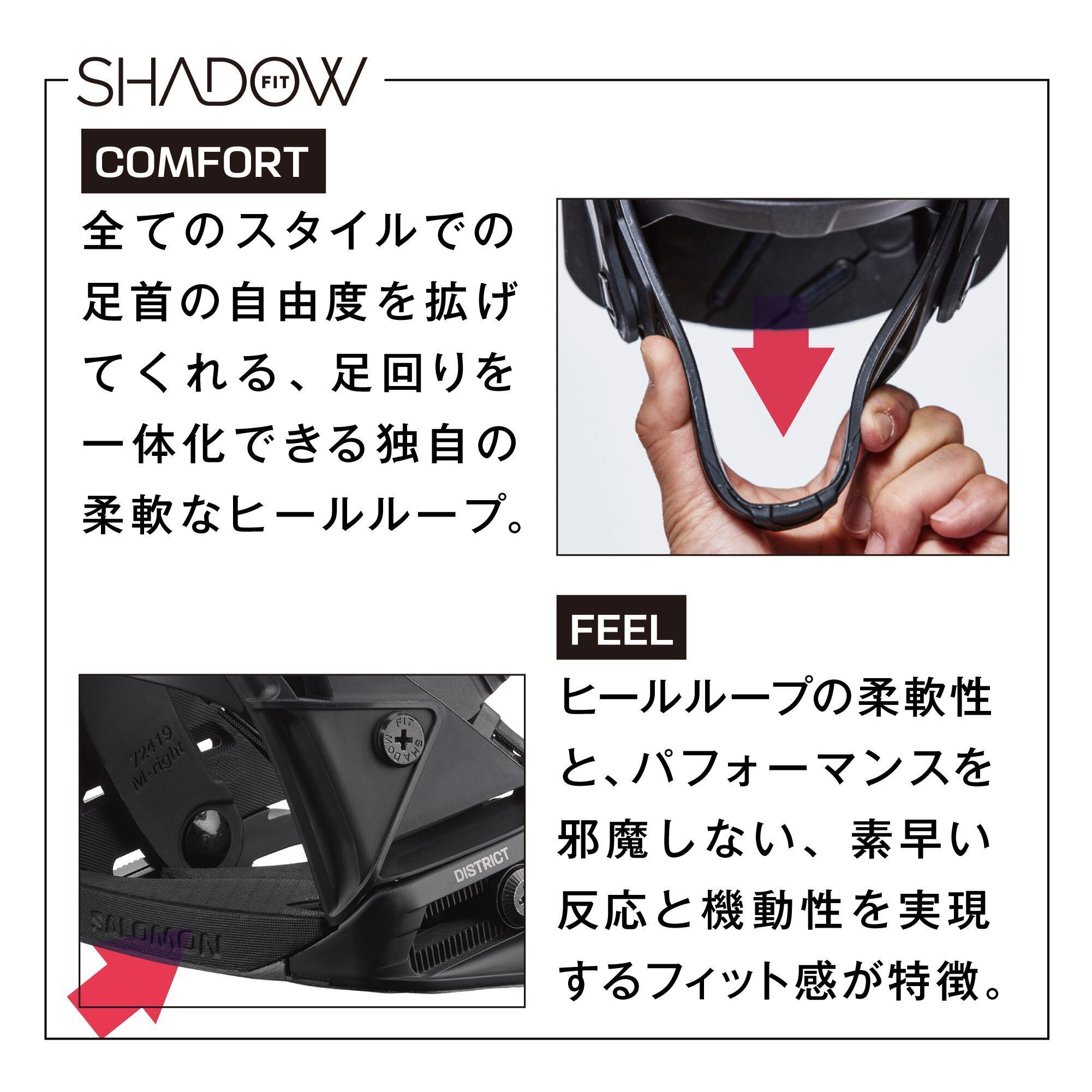 SHADOW FITビンディングは独自のソフトヒールカップを採用し、自然な一体感を提供します。これにより、ブーツとビンディングが連携し、一日中快適さと精密な操作性を実現します。