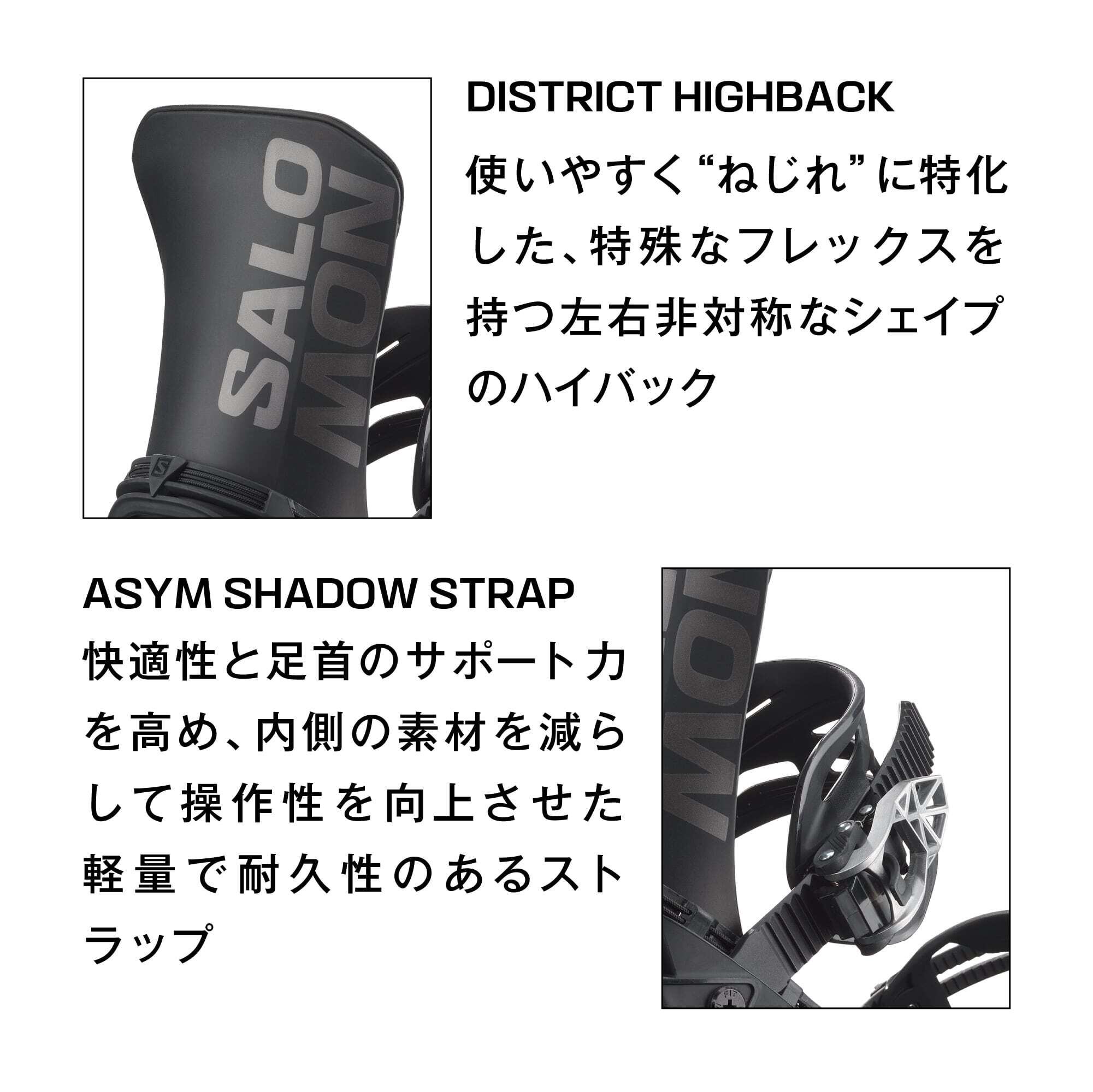 DISTRICTは柔らかめのフレックスと非対称デザインを採用したパークとグルーマーでの圧倒的な自由度を実現するビンディングです。SHADOW FITヒールカップがバインディングとブーツの一体感を高めることでより高いパフォーマンスと快適性を提供し、非対称ハイバックとインジェクションストラップがサポート力と操作性をバランス良く提供します。
