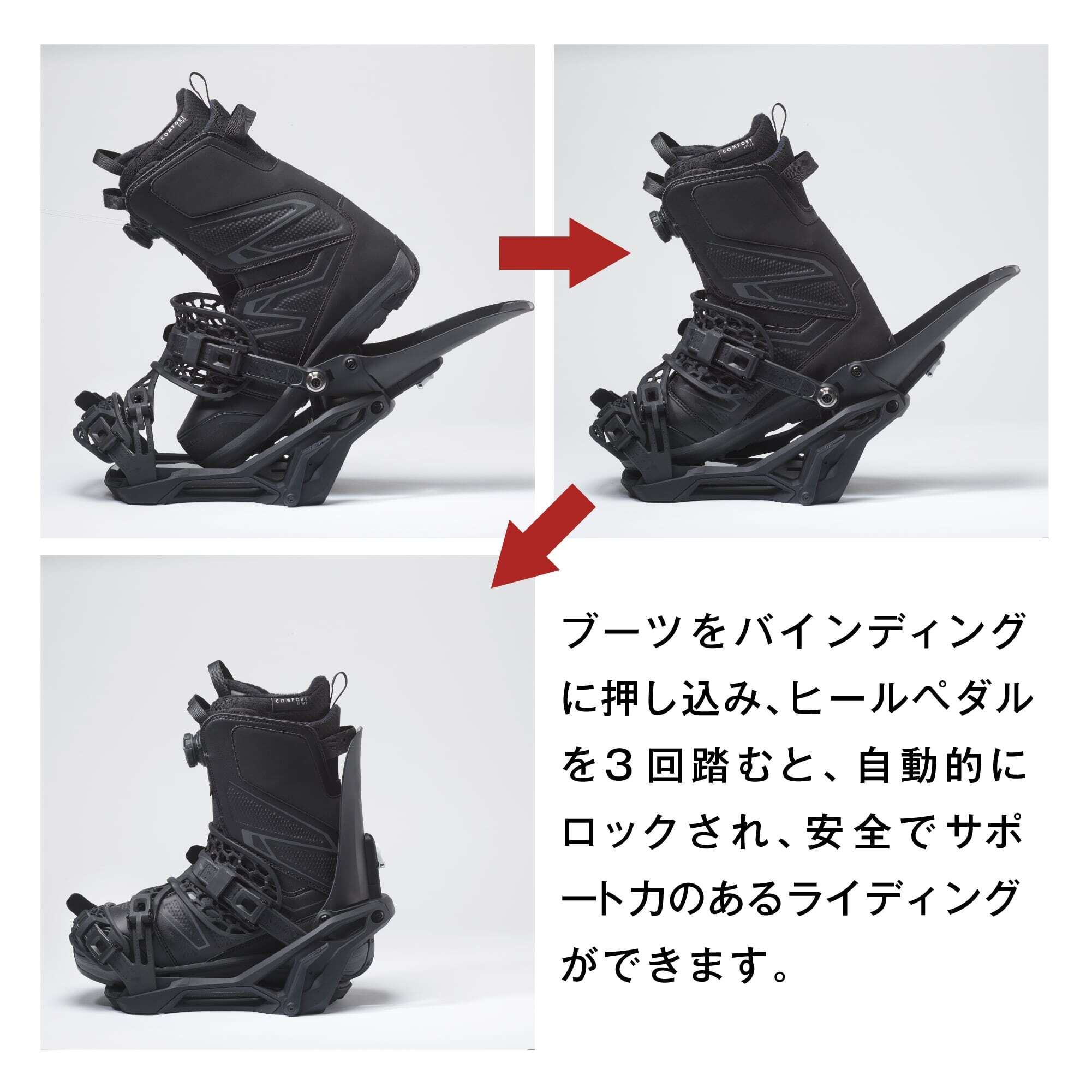 リクライニングするサロモン製のハイバックは、大きく開くことで容易なエントリーを可能にします。ブーツをバインディングに押し込み、ヒールペダルを3回踏むと、自動的にロックされ、安全でサポート力のあるライディングができます。この自動システムは、リリースレバーで簡単に脱着できます。レバーを押すだけで、バインディングから足を持ち上げることができます。