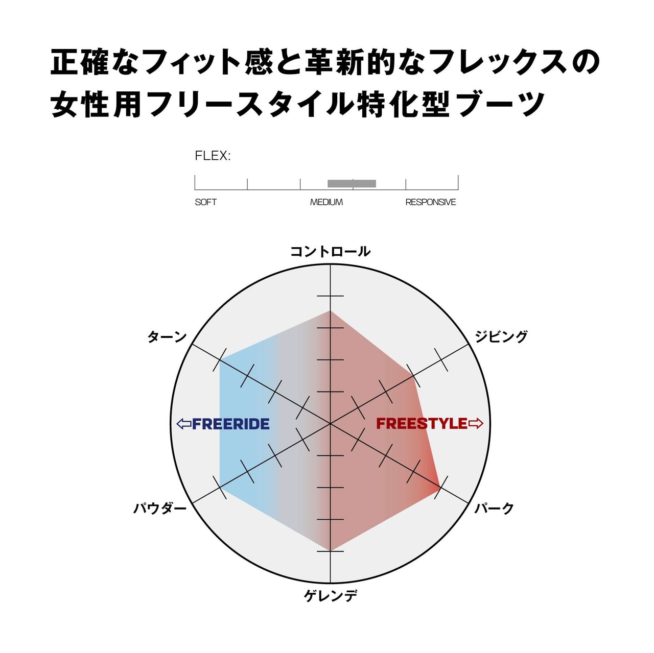 正確なフィット感とプログレッシブフレックスを提供するKIANA DUAL BOAはフリースタイルのブーツにゾーンごとの締め分けを採用し、プレシジョンハーネスが踵の浮きをおさえることで、心地の良いフィット感を提供します。フィットトゥライド構造を採用することで、軽量でありながら高い耐久性を提供し、足元にはグリップ力と衝撃吸収力を提供します。