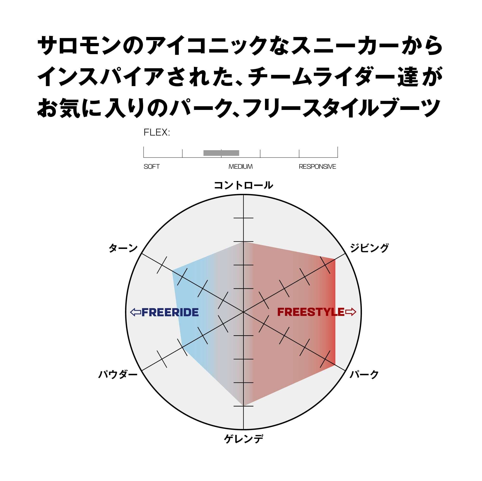 LAUNCH SJ BOAはサロモンのアイコニックなスニーカーからインスピレーションを得た、チームライダーお気に入りのパーク、フリースタイルブーツです。耐久性を備えた最高級の素材とフィットトゥライド構造が箱から出した瞬間から快適な履き心地を提供し、BOAを採用したSTR8JKTハーネスが踵の浮きをおさえ、ズレのないフィット感を提供します。