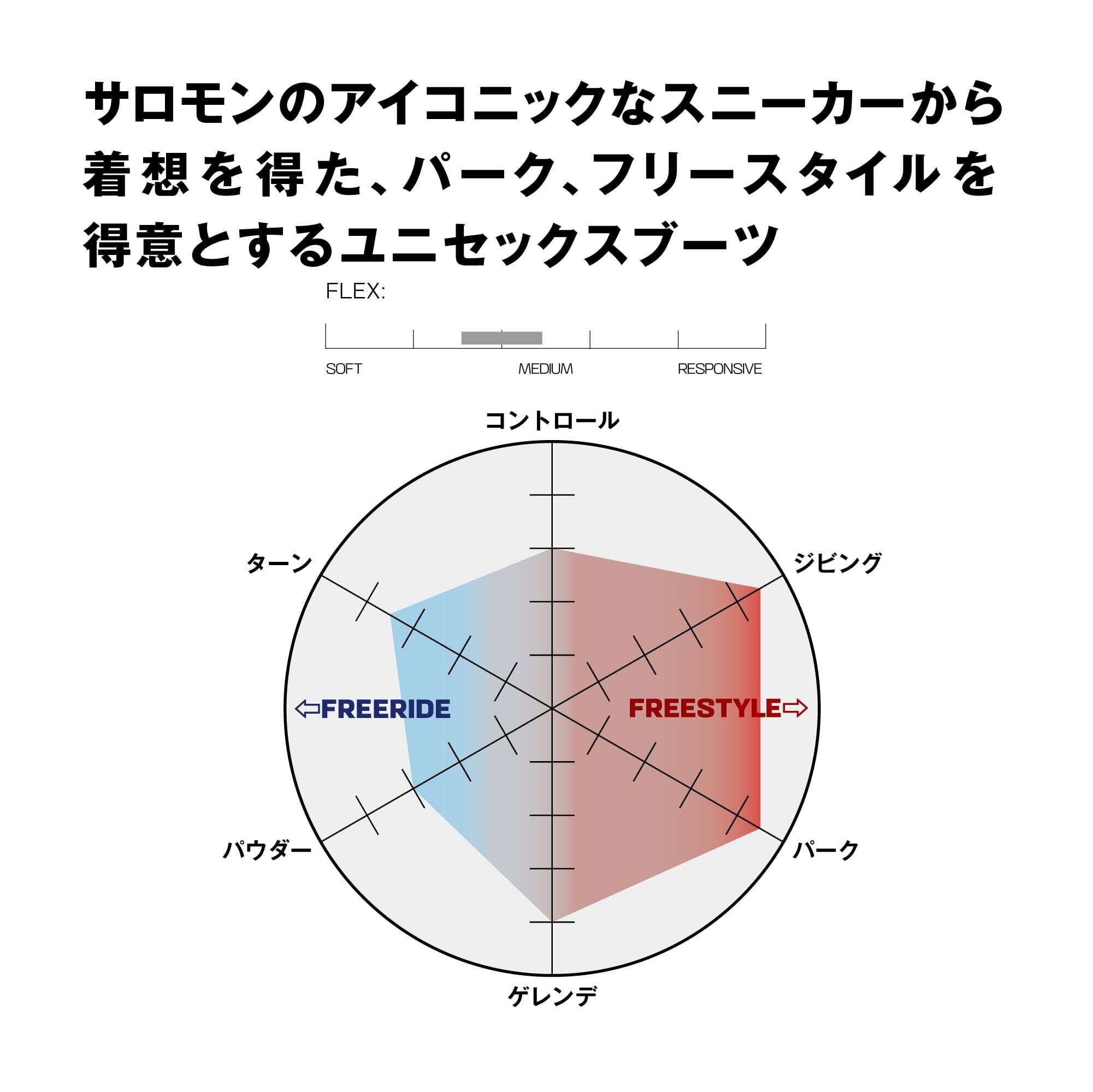 X APPROACH LACE SJ BOAはアイコニックなサロモンのスニーカーからインスピレーションを得た、パーク、フリースタイルを得意とするユニセックスブーツです。最高級の素材とフィットトゥライド構造が、軽量でありながら最高級の快適性を提供します。BOAを採用したSTR8JKTハーネスが踵の浮きをおさえ、高いサポート力を提供します。
