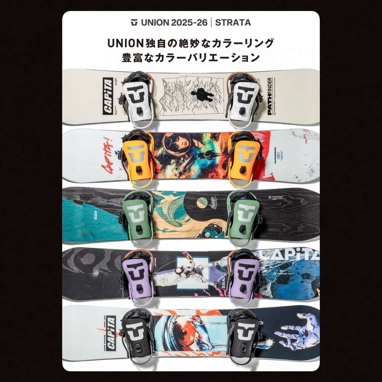 UNION STRATAの柔らかく,サーフィーで衝撃吸収性のあるライドフィールは,パークをクルージングしたり,山全体をサーフするように滑りたいスノーボーダーに最適です。