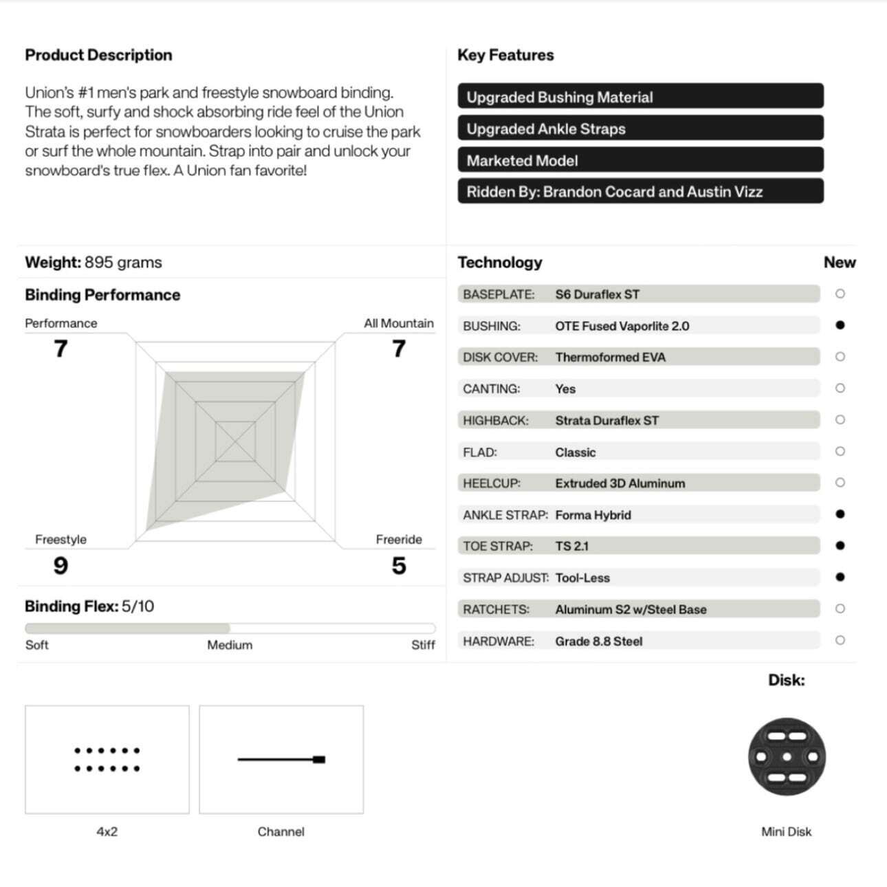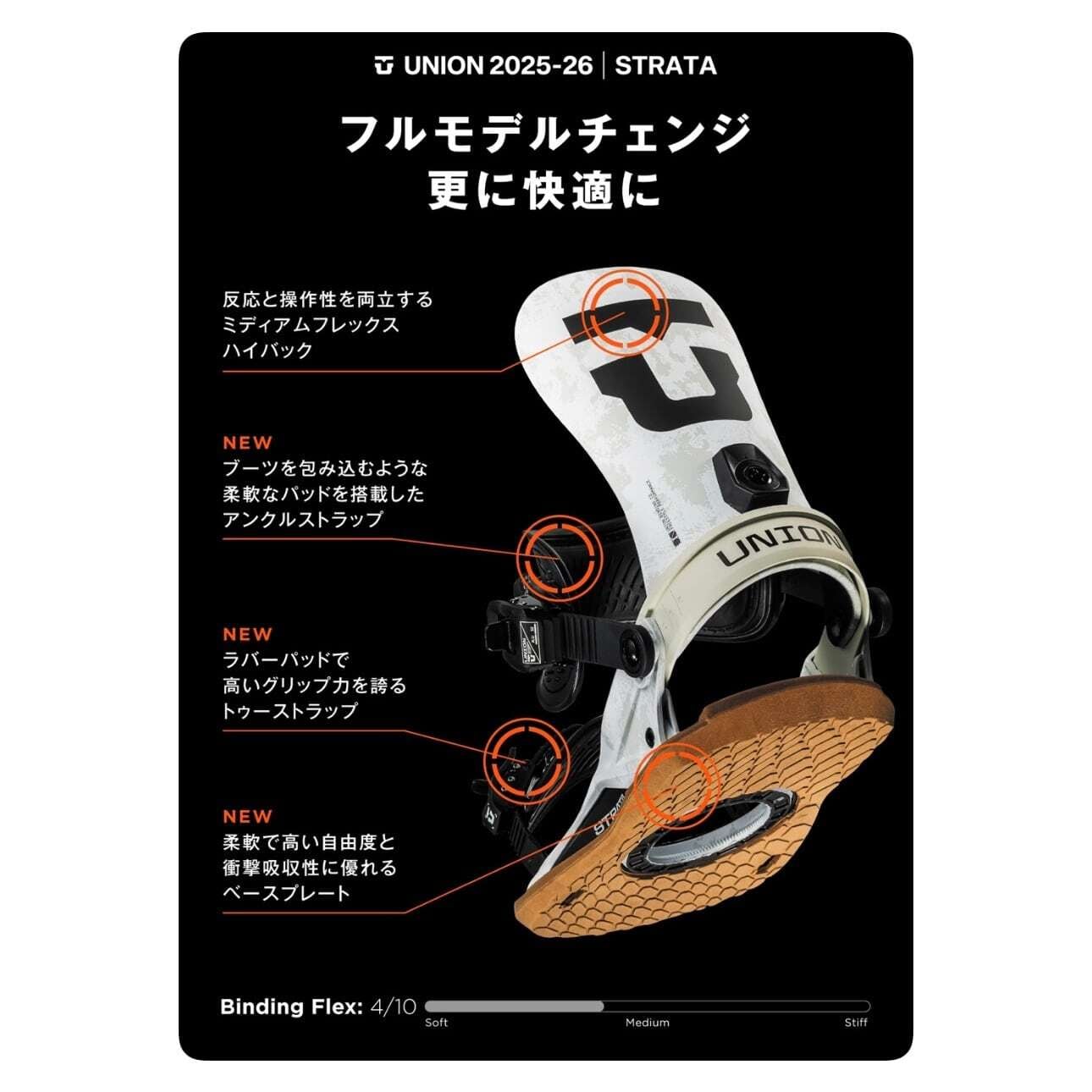 UNION STRATAの柔らかく,サーフィーで衝撃吸収性のあるライドフィールは,パークをクルージングしたり,山全体をサーフするように滑りたいスノーボーダーに最適です。