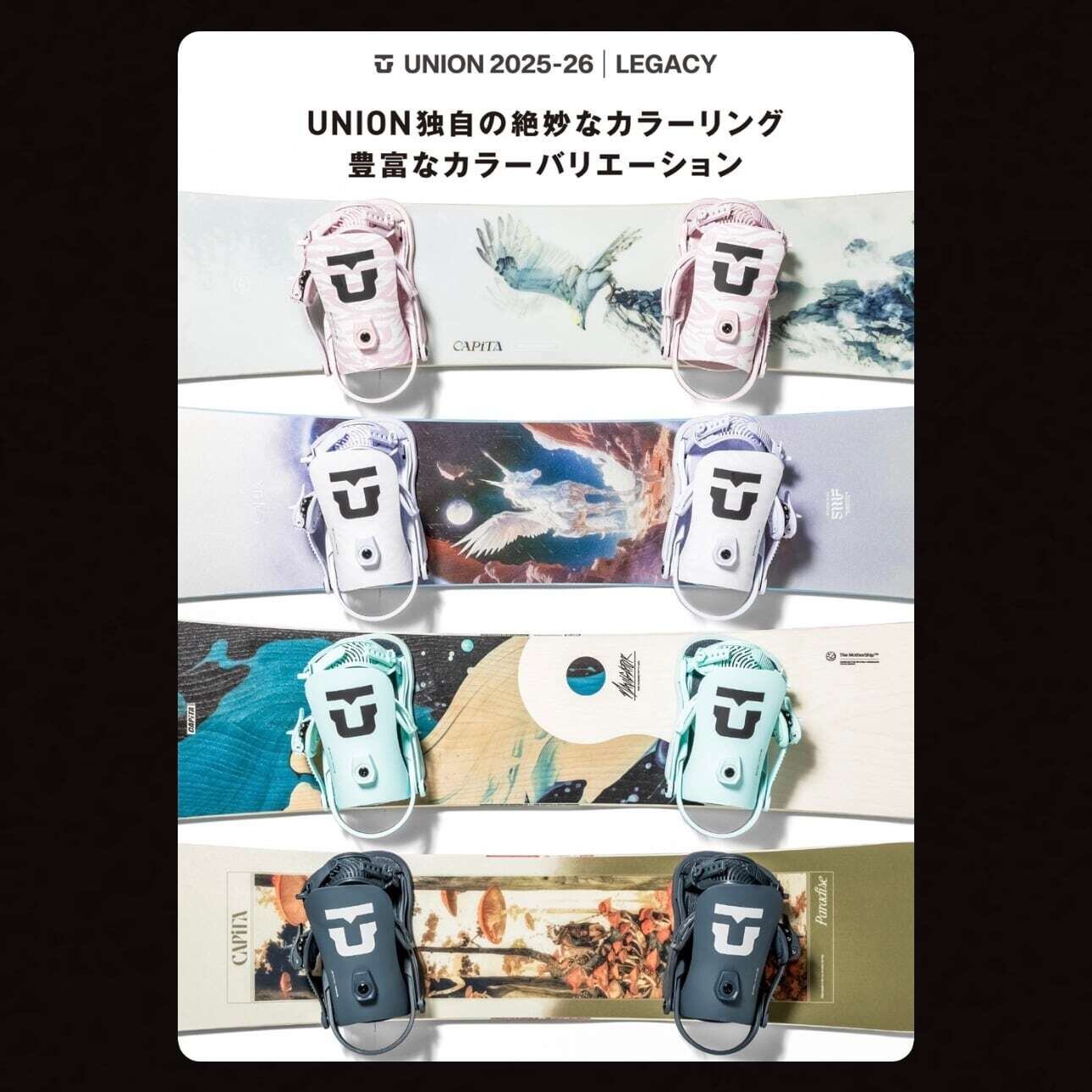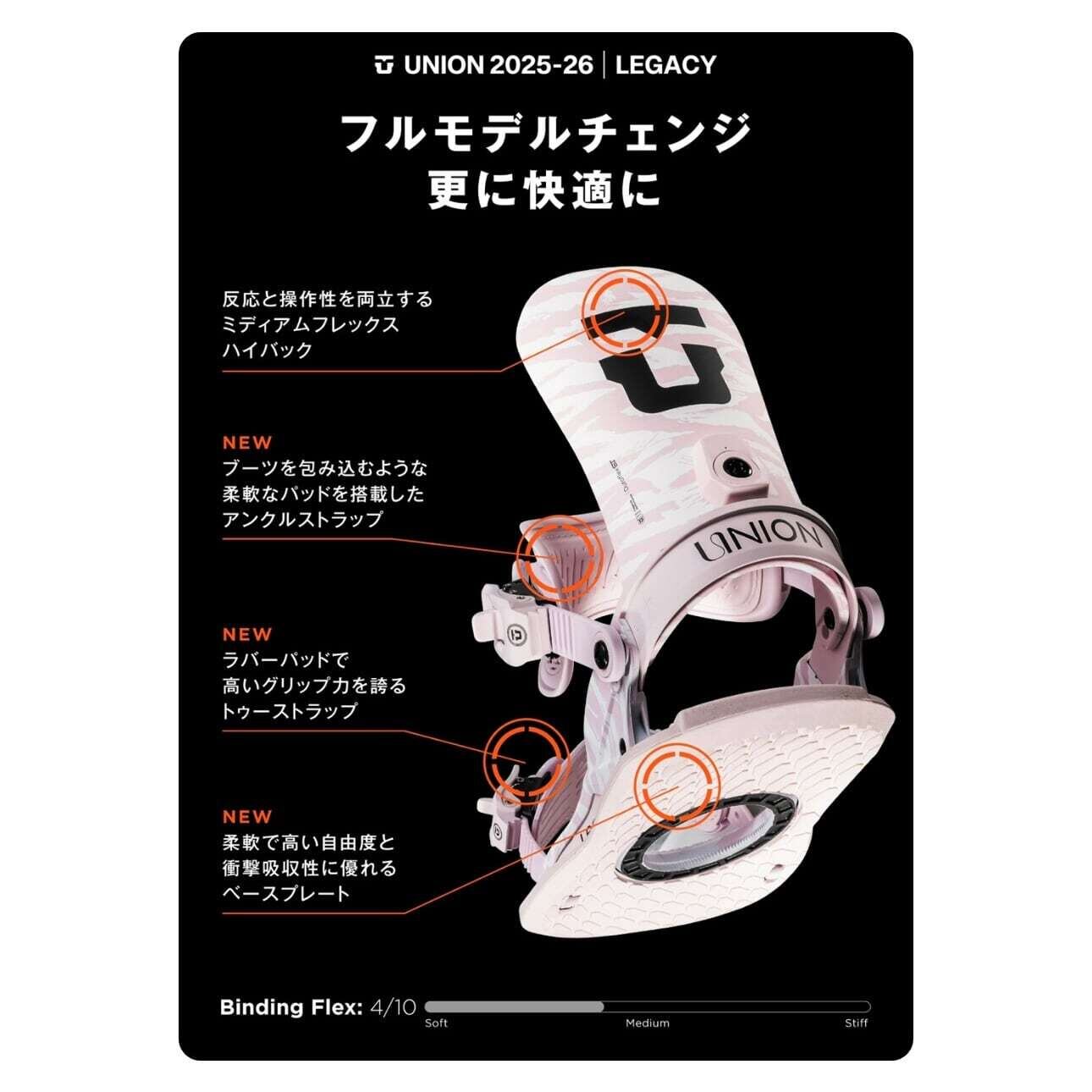 Union Legacy(レガシー)は、柔らかくサーフィーで衝撃吸収性に優れたライドフィールを提供し、パークを自由に流したり、山全体をスタイリッシュに滑りたいスノーボーダーに最適です。