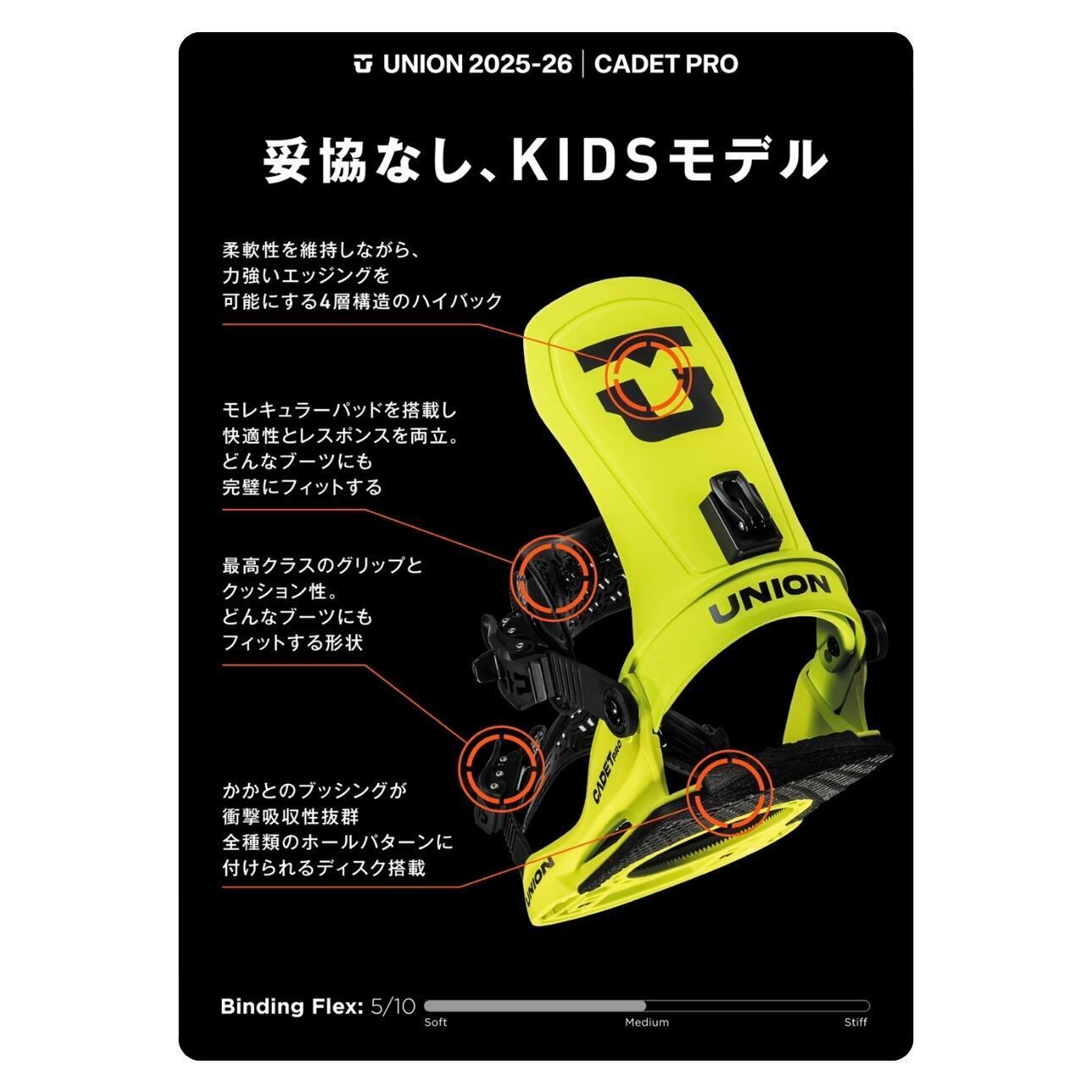 UNION CADET PRO(カデットプロ)は、柔らかめのフレックスと高い操作性を備えたキッズ&ヤングティーンズ向けバインディングです。