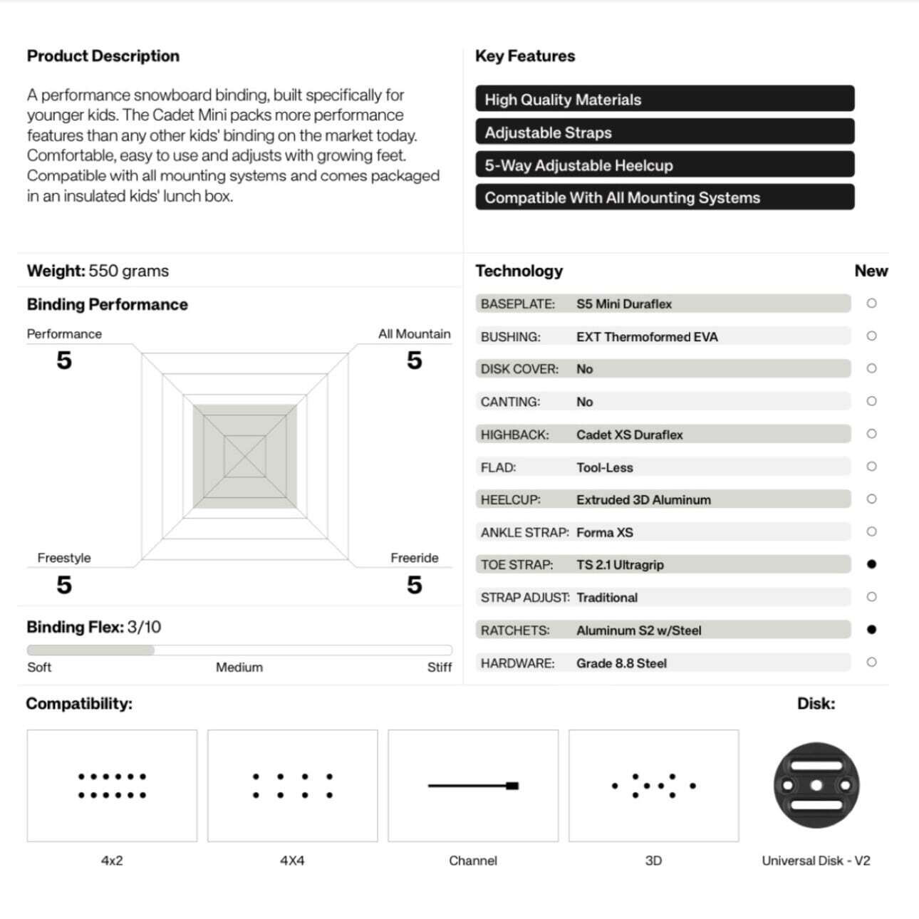 UNION CADET MINI(カデットミニ)は、より小さな子供向けに設計された高性能キッズバインディングです。