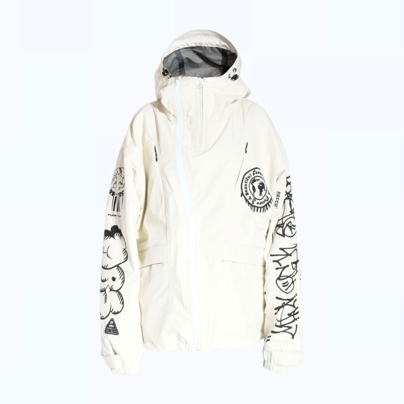 生地にはPREVENT-EXリサイクルFABRICを使用、耐水圧20,000mm、透湿性12,000g/㎡/24h、生地表面には超撥水加工を施し、水弾きを更に向上させています。