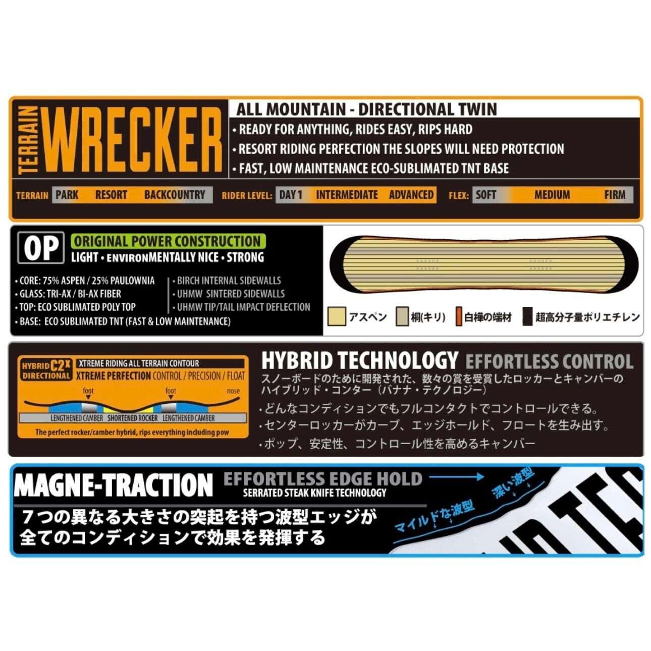 一昨年から生まれ変わったTerrain Wreckerは、よりハードなリッピング、パワフルなライディングを可能にしました。山全体を走破するディレクショナルティップとフリースタイルのためのツインシャーシのコンビネーション。C2xハイブリッド形状とやや太めでソフトなフレックス。リゾートでハードチャージできる理想的なドリームボードです。