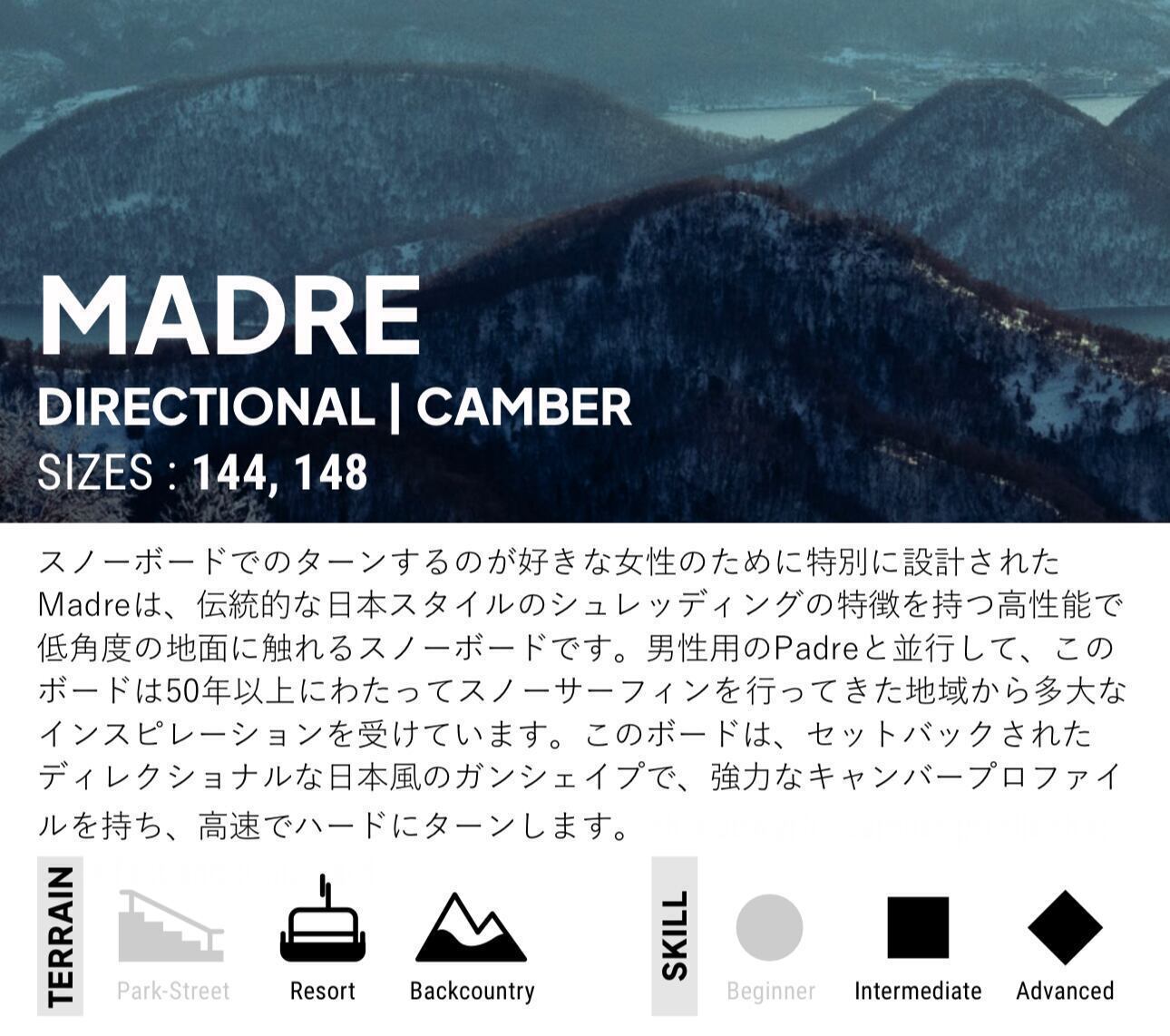 スノーボードでのターンするのが好きな女性のために特別に設計されたMADREは、伝統的な日本スタイルのシュレッディングの特徴を持つ高性能で低角度の地面に触れるスノーボードです。男性用のPADREと並行して、このボードは50年以上にわたってスノーサーフィンを行ってきた地域から多大なインスピレーションを受けています。このボードは、セットバックされたディレクショナルな日本風のガンシェイプで、強力なキャンバープロファイルを持ち、高速でハードにターンします。