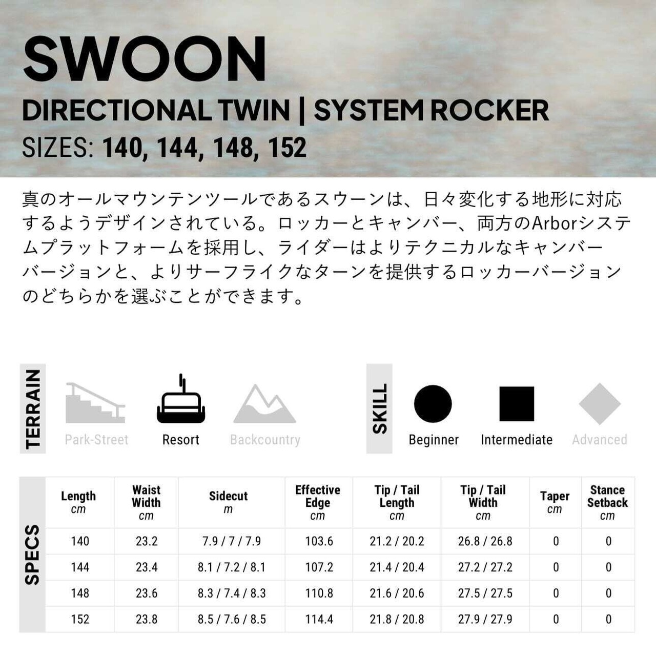 真のオールマウンテンツールであるスウーンは、日々変化する地形に対応するようデザインされている。ロッカーとキャンバー、両方のARBORシステムプラットフォームを採用し、ライダーはよりテクニカルなキャンバーバージョンと、よりサーフライクなターンを提供するロッカーバージョンのどちらかを選ぶことができます。