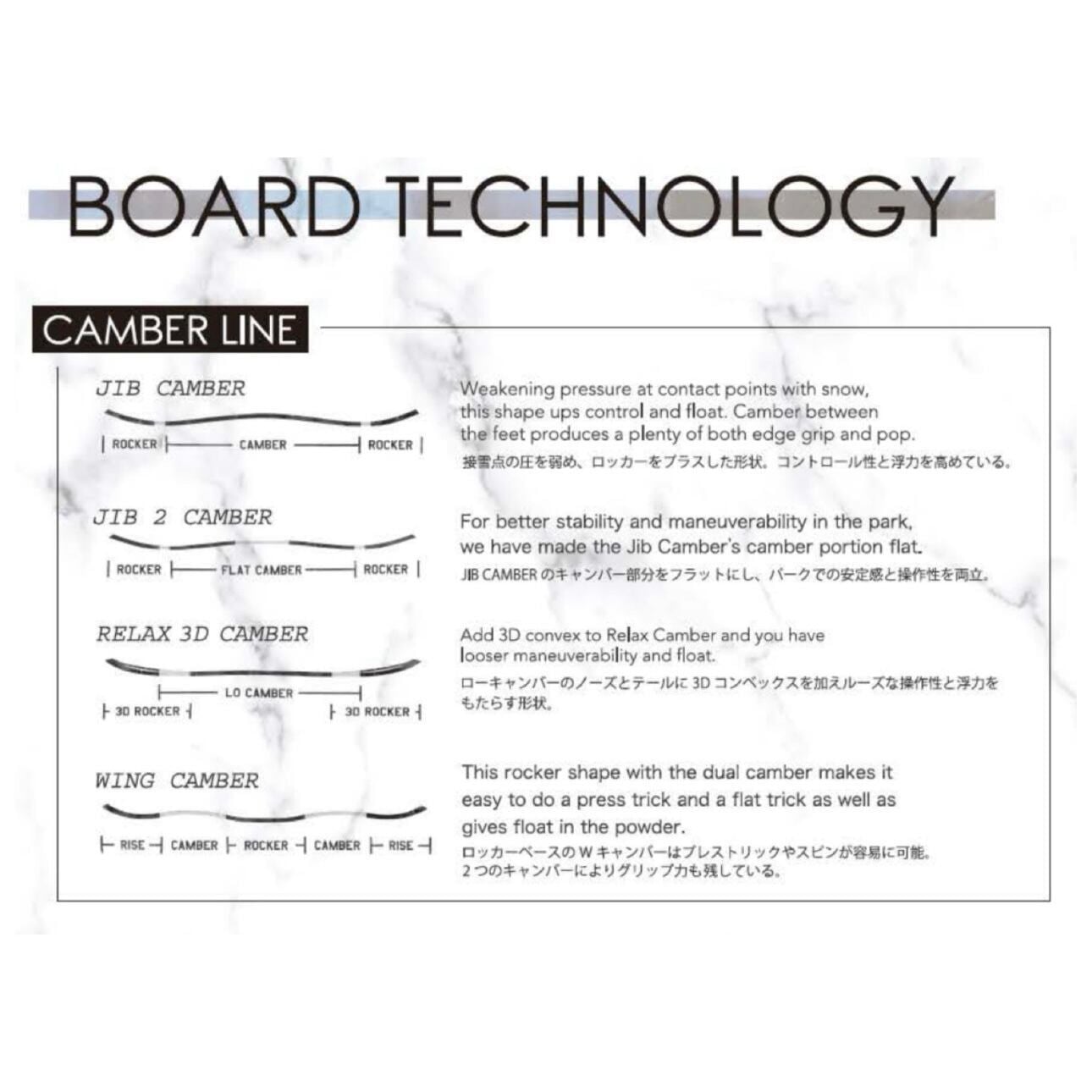 WING CAMBER:ロッカーベースのWキャンバーはプレストリックやスピンが容易に可能。2つのキャンバーによりグリップ力も残している。