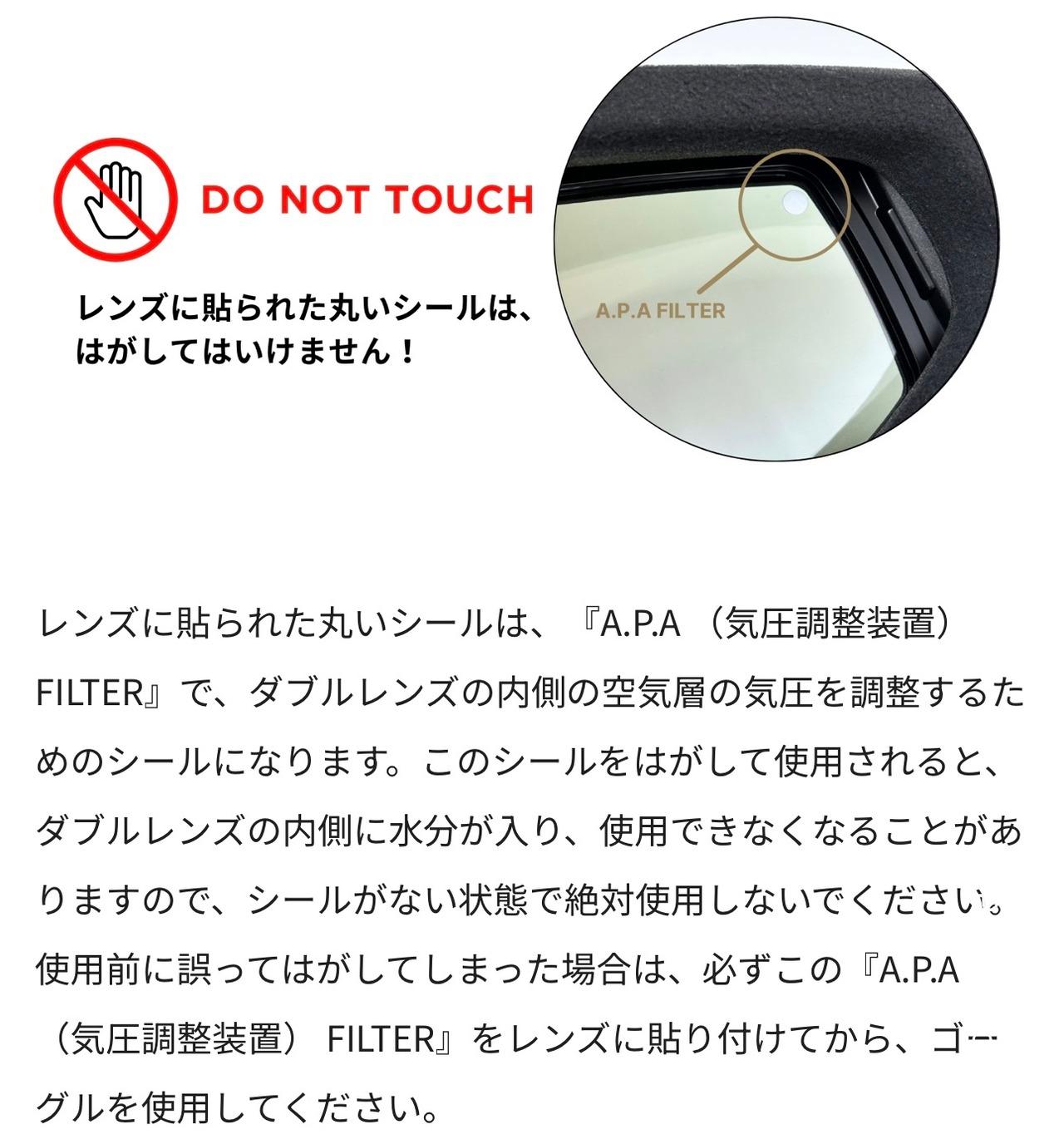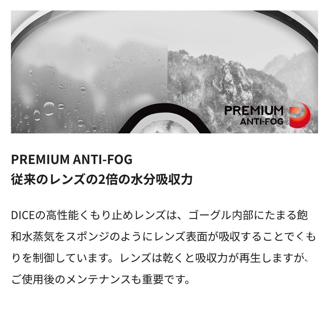 従来のレンズの2倍の水分吸収力DICEの高性能くもり止めレンズは、ゴーグル内部にたまる飽和水蒸気をスポンジのようにレンズ表面が吸収することでくもりを制御しています。