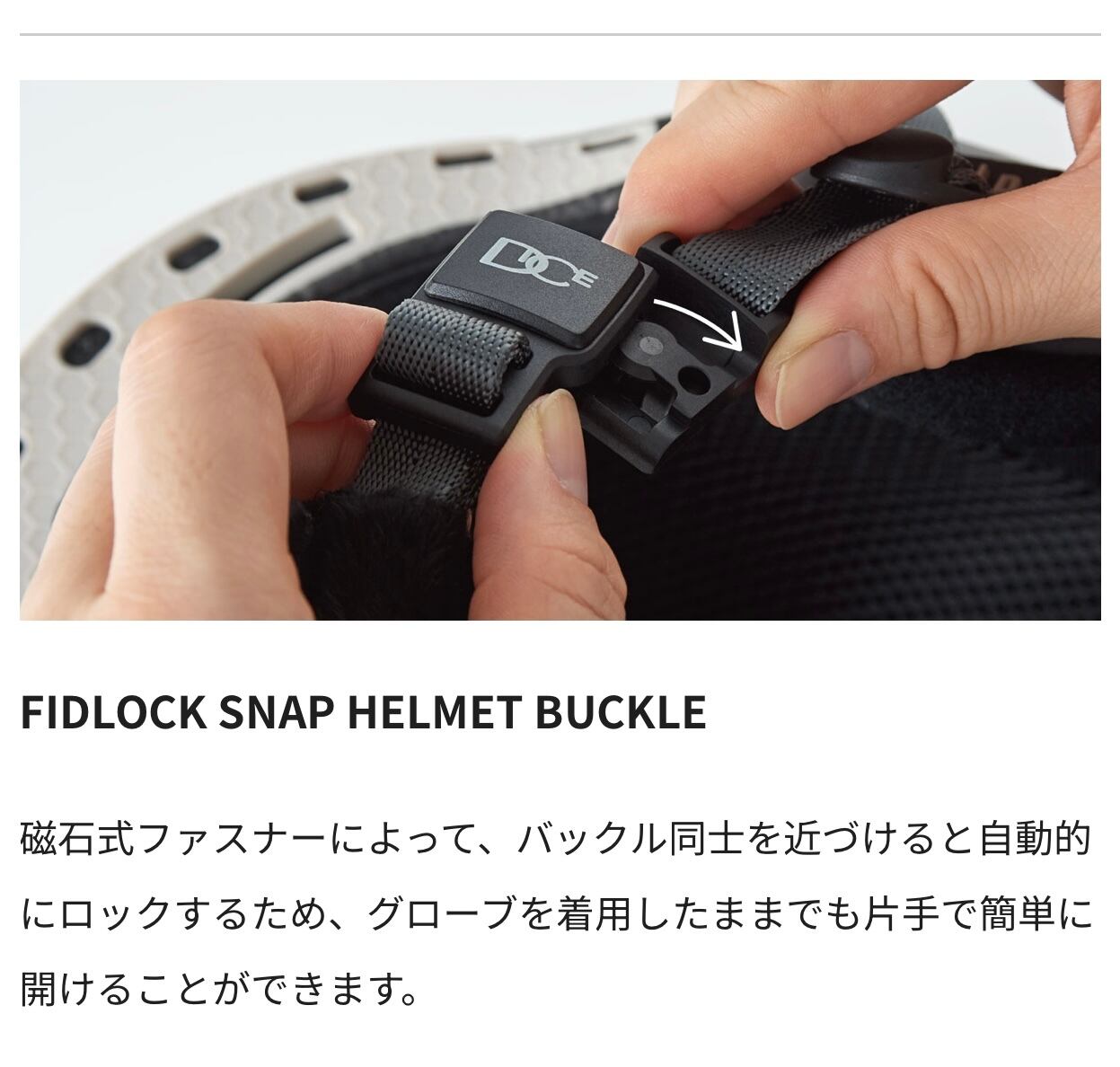 磁石式ファスナーによって、バックル同士を近づけると自動的にロックするため、グローブを着用したままでも片手で簡単に開けることができます。