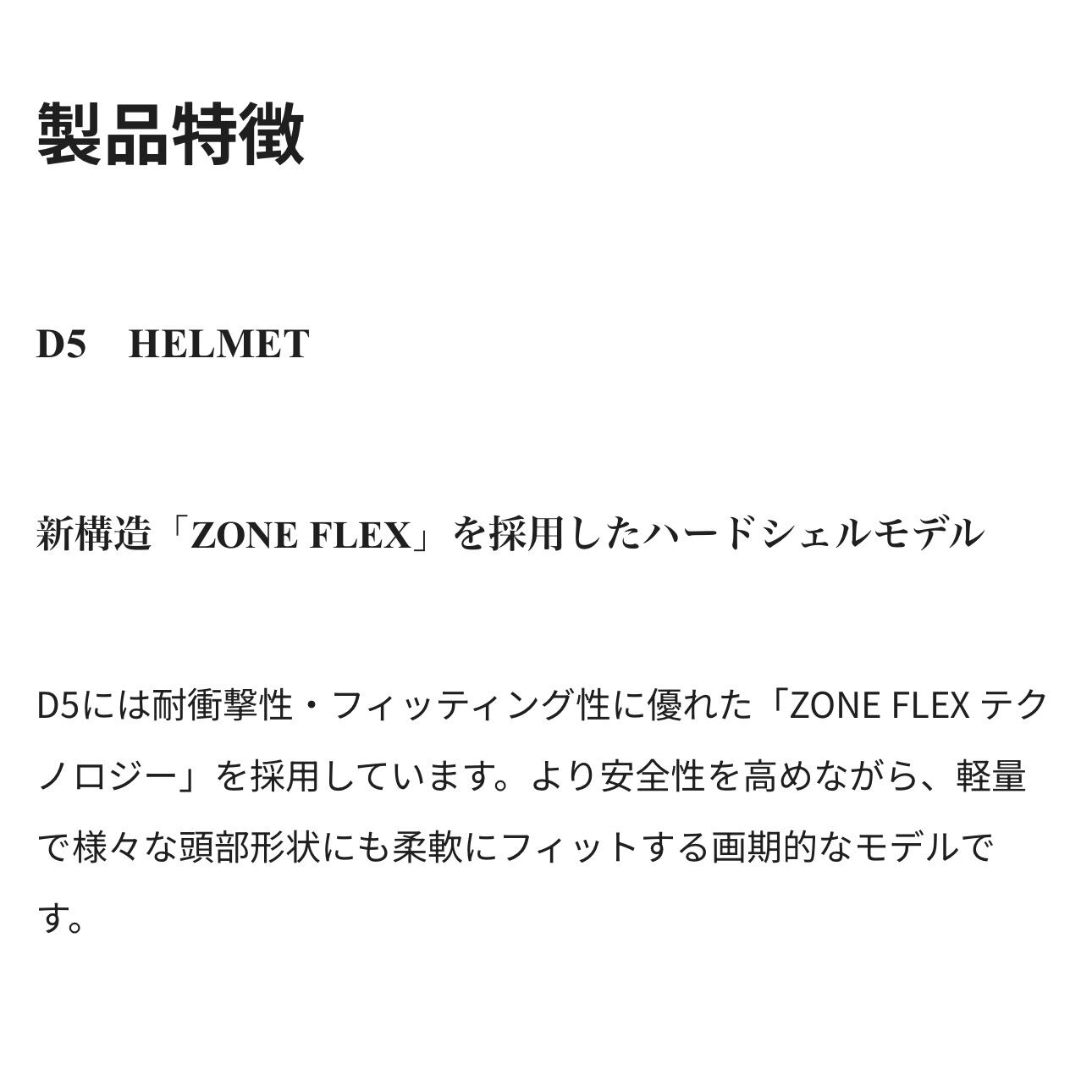 D5には耐衝撃性・フィッティング性に優れた「ZONE FLEX テクノロジー」を採用しています。より安全性を高めながら、軽量で様々な頭部形状にも柔軟にフィットする画期的なモデルです。