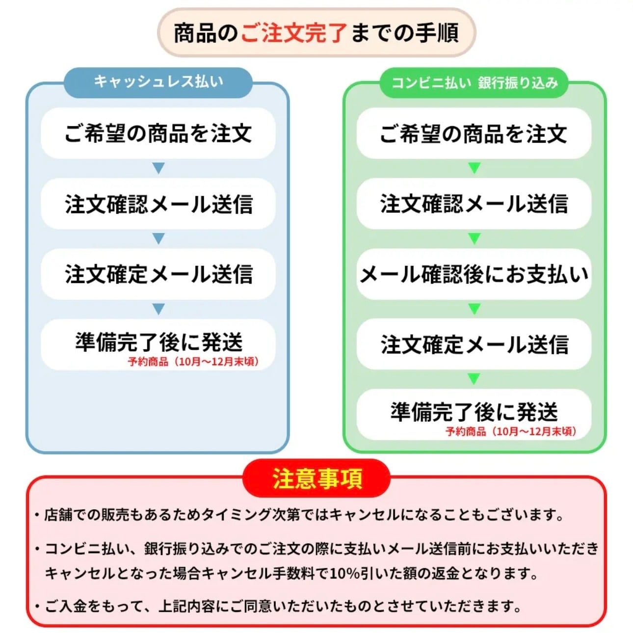なお、ご注文確認メール送信前にご入金いただき、在庫が完売となっていた場合は、購入代金の10%を返金手数料として頂戴いたします。あらかじめご了承くださいませ。