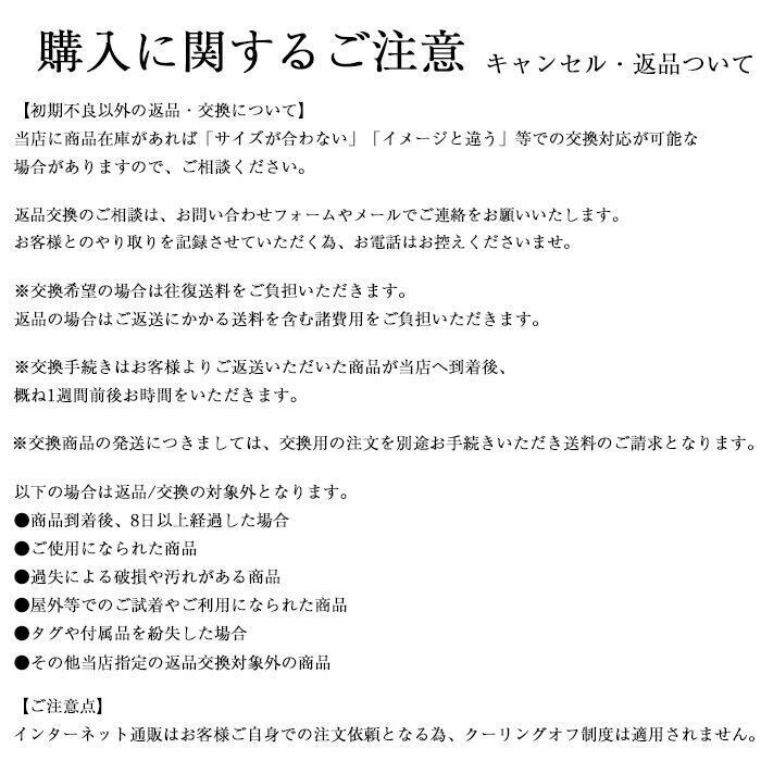 ご注文後のお客様都合によりますカラー・サイズ変更及び返品・キャンセル等は一切お受け致しておりません。万が一キャンセルとなった場合にはキャンセル料として購入金額の10%をお支払い頂く形となりますので予めご了承の程宜しくお願い申し上げます。