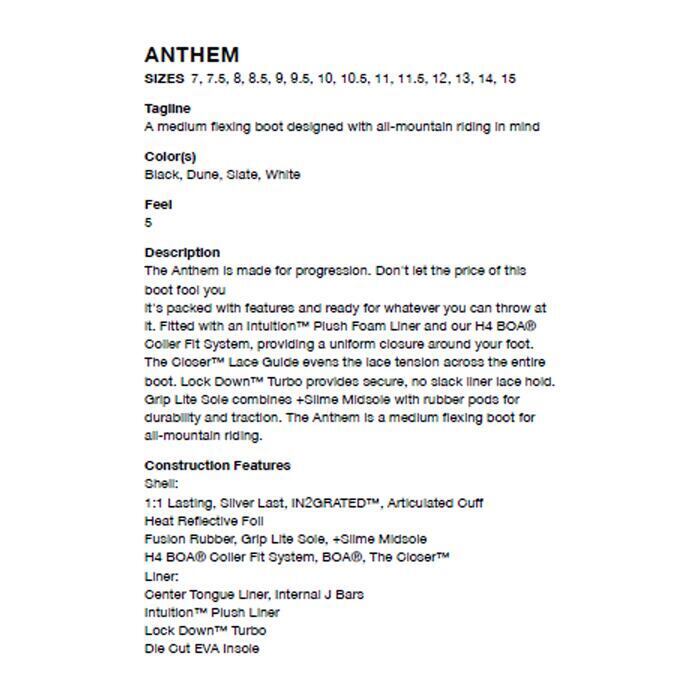 『 ANTHEMは手頃な価格だからと言って侮れない充分なテクノロジーを搭載しています。Intuition?-Plush-Foam-Linerはフィット感に優れ、H4-BOA?Coiler-Fit-Systemが足をしっかりとホールド。Closer?-Lace-GuideとLock-Down?-Turboがブーツ全体を均一にサポートします。また、Grip-LiteアウトソールとSlime-Midsoleの組み合わせにより耐久性と雪上でのグリップに優れます。ANTHEMは上達を目指すライダーにお薦めしたいミッドフレックスブーツです。 』